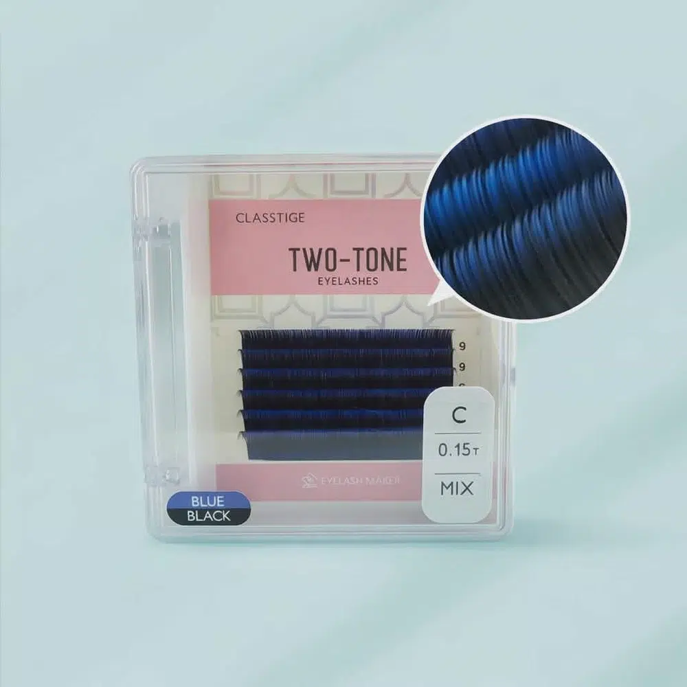Cils bicolores noir et bleu au dégradé moderne et élégant. Courbe C pour un regard ouvert et lumineux. Épaisseur 0.15 idéale pour un volume léger à moyen. Boîte mix 9 à 13 mm pour des poses personnalisées et créatives.