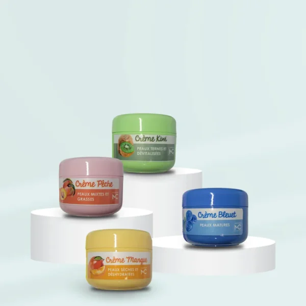 | Skin type | Dry and Dehydrated (Mango), Dull and devitalized (Kiwi), Mature (Cornflower), Mixed and Oily (Peach) |