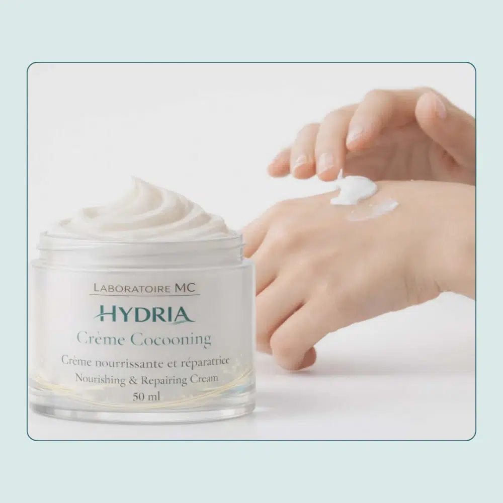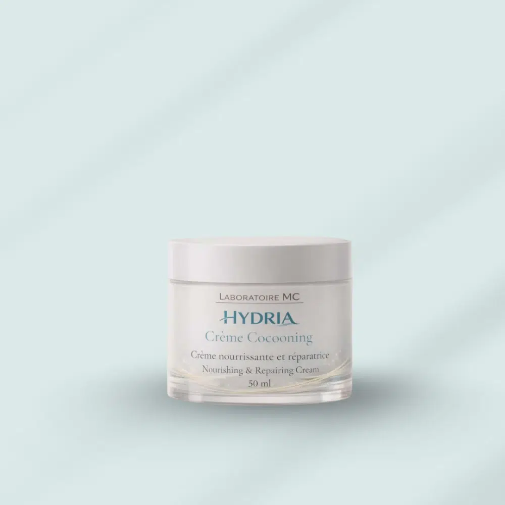 The Hydria Cocooning Cream is a restorative moisturizing cream designed to envelop the skin in true comfort. Its rich texture absorbs easily without leaving a greasy film, while providing lasting hydration and an immediate soothing effect.