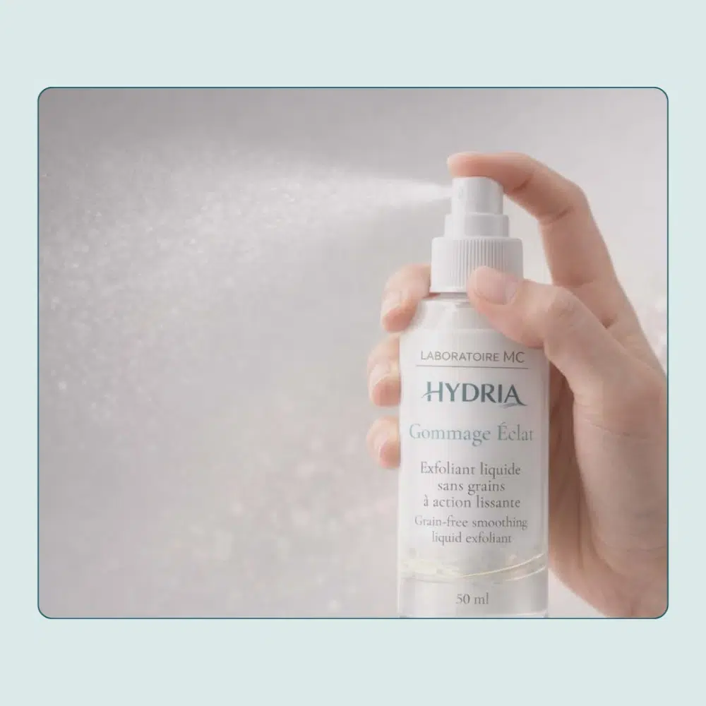 The Hydria Radiance Scrub is an innovative spray exfoliant that gently removes dead skin cells without harsh grains. Its liquid texture applies directly to dry skin, dries in seconds, then transforms under your fingertips into a delicate, skin-respecting scrub.