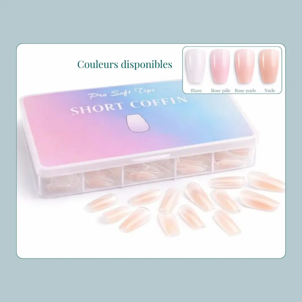 PMMA soft gel type tips, ultra-flexible and durable, designed for American application and press-on nails. Their flexible structure perfectly conforms to the natural nail while offering excellent strength at the free edge.