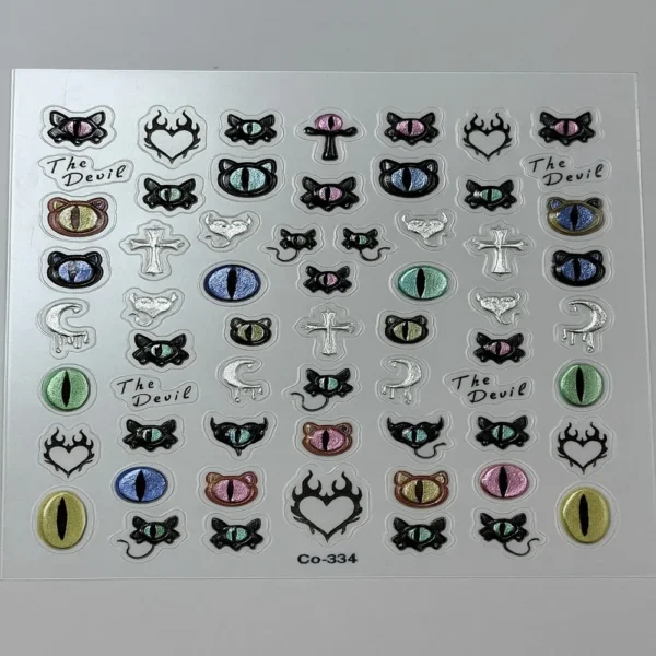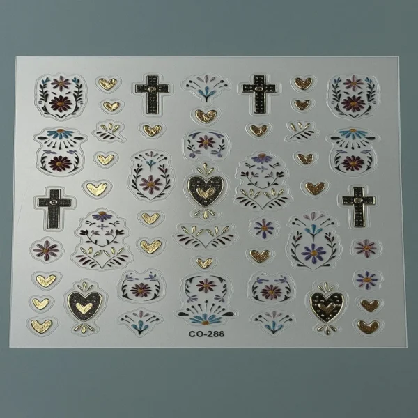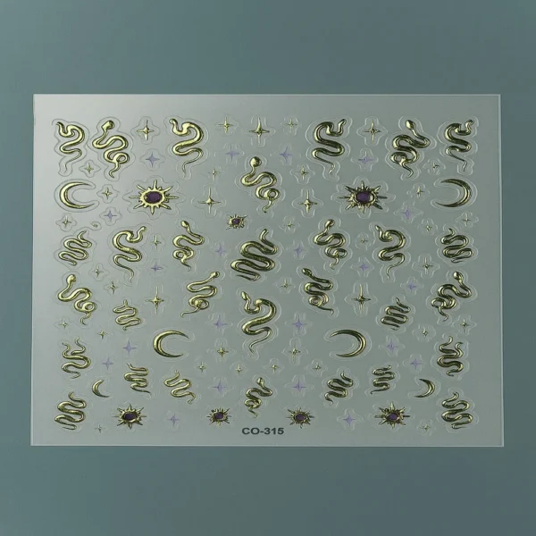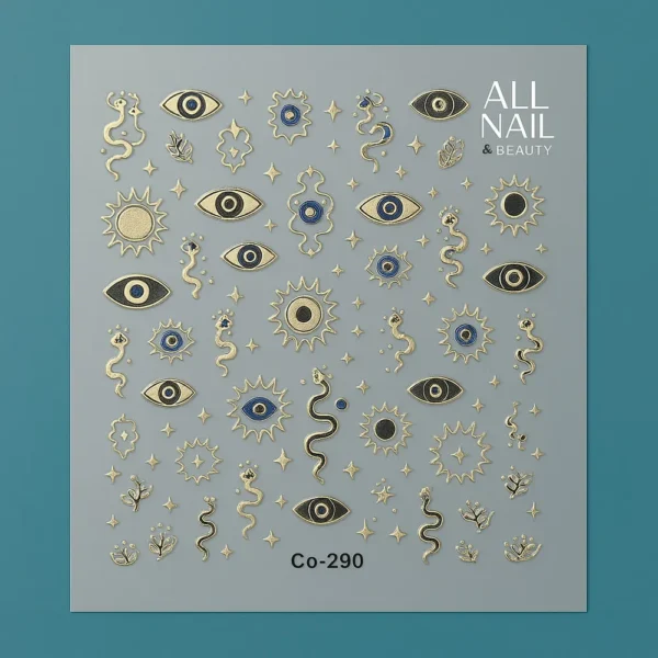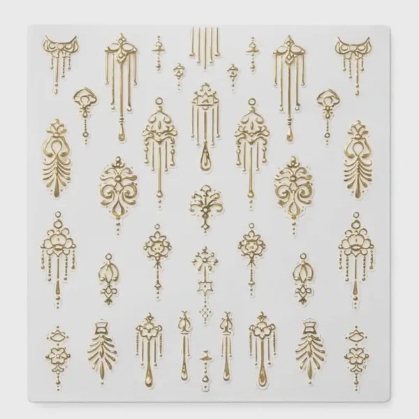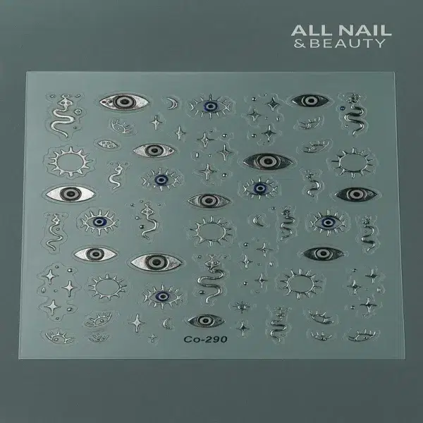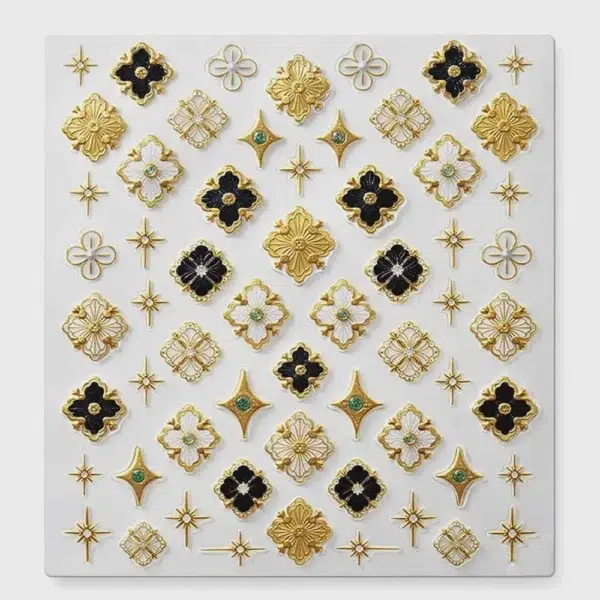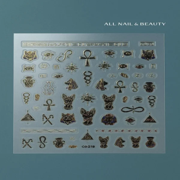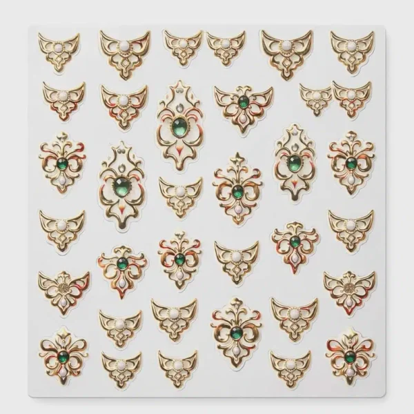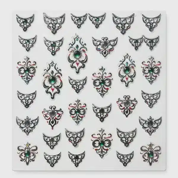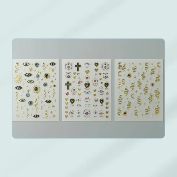 Inspirée des bijoux et de l’art décoratif, cette collection inclut des designs variés : yeux mystiques, lunes, serpents, croix, symboles, cœurs, lèvres et ornements royaux, parfaits pour ajouter une touche d’élégance, de mystère ou de glamour à vos ongles.
