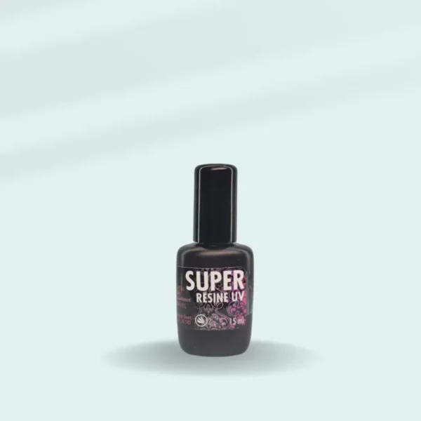 Super résine u.v : 1/2 oz. Densité liquide ou moyenne. S’utilise avec une lampe u.v et de la poudre d’acrylique. Doit être conservée au réfrigérateur et doit être utilisée dans un délais de 60 à 90 jours. Peut également remplacer la finition et la base crystal.